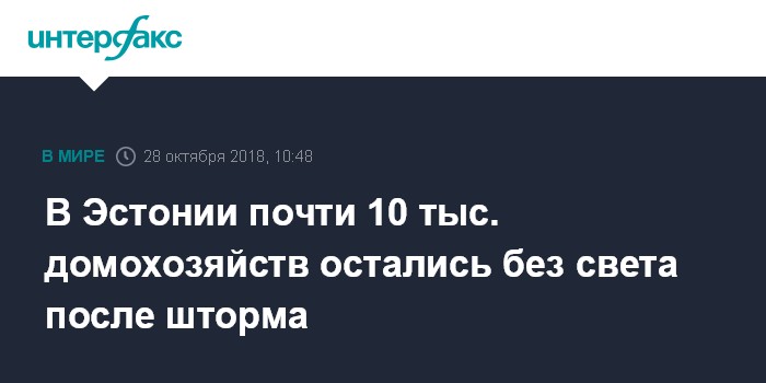 Москва. 28 октября. INTERFAX.RU - Штормовой ветер с порывами до 29 метров в секунду, бушевавший в ночь на воскресенье в Эстонии, оставил без электричества более 9,5 тысяч домохозяйств.