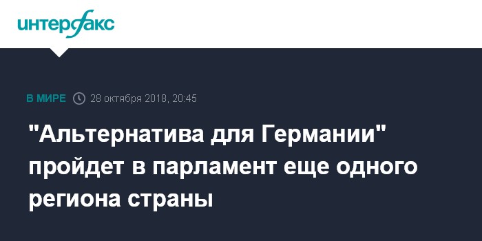 Москва. 28 октября. INTERFAX.RU - Правая "Альтернатива для Германии" (АдГ) проходит в еще один региональный парламент - ландтаг земли Гессен - и может получить около 12% -13% голосов, свидетельствуют результаты опросов, проведенных на выходе с избирательных участков в воскресенье вечером.