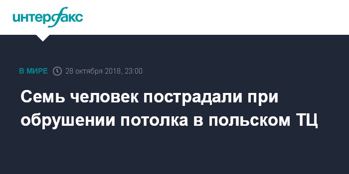 Москва. 28 октября. INTERFAX.RU - Семь человек пострадали в результате обрушения подвесного потолка в торговом центре в городе Жешув на юго-востоке Польши, сообщает в воскресенье издание Rzeszów News.