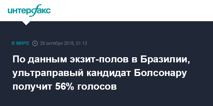 По данным экзит-полов в Бразилии, ультраправый кандидат Болсонару получит 56% голосов