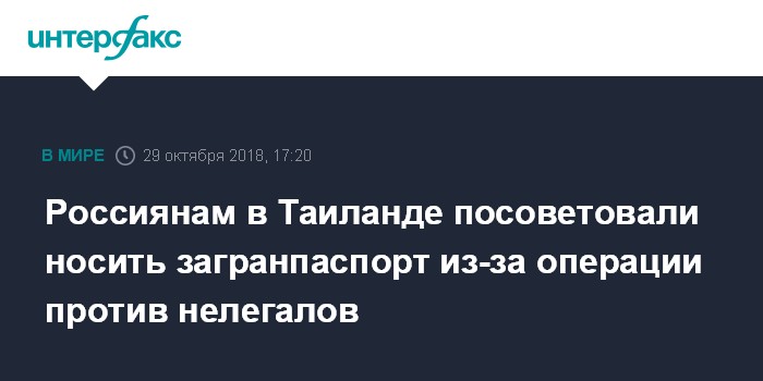 Москва. 29 октября. INTERFAX.RU - Посольство России в Таиланде посоветовало российским туристам всегда носить с собой загранпаспорт из-за ужесточения иммиграционных требований к иностранцам в этой стране.
