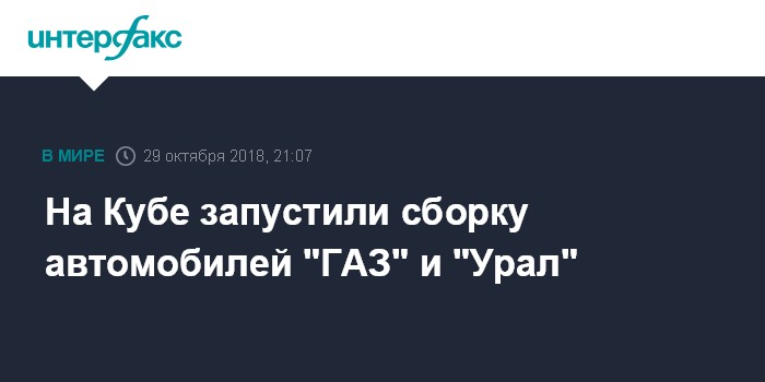 Москва. 29 октября. INTERFAX.RU - Группа "ГАЗ" запустила на Кубе сборочное производство автомобилей "ГАЗ" и "Урал", сообщил вице-премьер РФ Юрий Борисов.