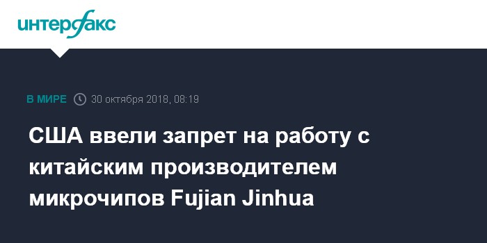 Министерство торговли США запретило в понедельник всем американским компаниям вести бизнес с китайским производителем микрочипов Fujian Jinhua Integrated Circuit Company, которого американская Micron Technology обвинила в краже технологических секретов.