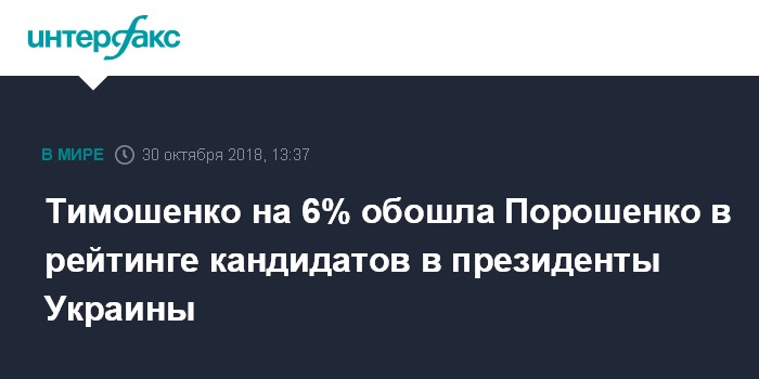 Москва. 30 октября. INTERFAX.RU - Лидер партии ВО "Батькивщина" Юлия Тимошенко имеет наивысший рейтинг среди потенциальных кандидатов в президенты Украины - 15%, тогда как за действующего главу государства Петра Порошенко готовы проголосовать 9% избирателей.