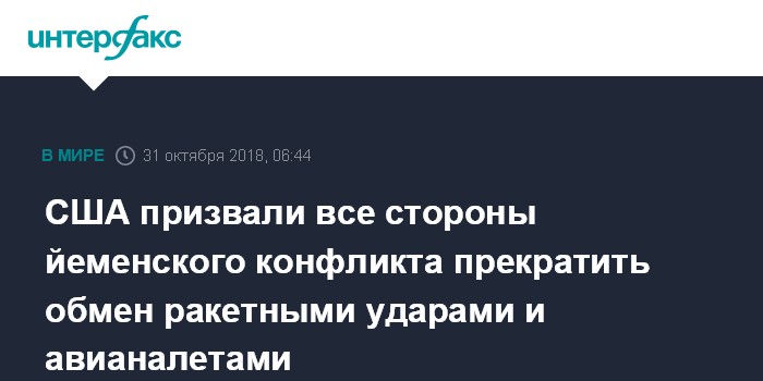 Москва. 31 октября. INTERFAX.RU - Соединенные Штаты выступили с призывом ко всем сторонам вооруженного конфликта в Йемене о прекращении обмена ракетными ударами и авианалетами и поиске путей мирного решения проблемы, сообщил американский госдепартамент.
