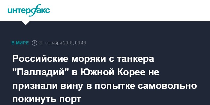 Москва. 31 октября. INTERFAX.RU - Четверо членов экипажа российского танкера "Палладий", задержанного в августе береговой охраной Южной Кореи после попытки самовольно покинуть порт Пусан, в среду на заседании суда не признали вину.