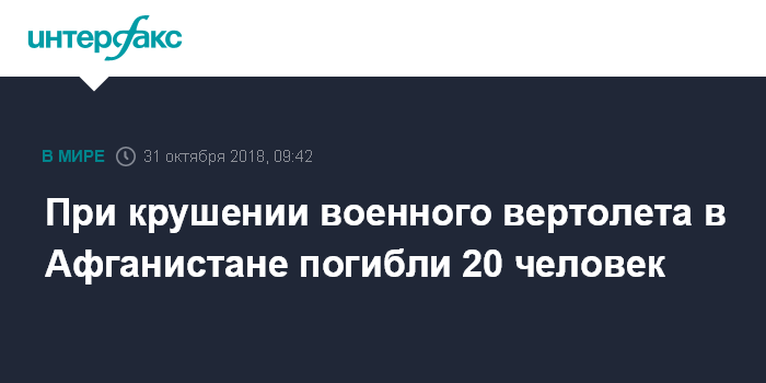 Москва. 31 октября. INTERFAX.RU - Двадцать человек погибли в крушении военного вертолета в провинции Фарах на западе Афганистана, причины катастрофы уточняются, сообщает в среду информагентство Associated Press.