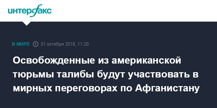 Москва. 31 октября. INTERFAX.RU - Пять членов движения "Талибан" (запрещено в РФ), которых в 2014 году освободили из центра задержания на американской военной базе в Гуантанамо, теперь будут принимать участие в мирных переговорах по Афганистану, передает агентство Associated Press со ссылкой на представителя талибов Забиуллу Муджахида.