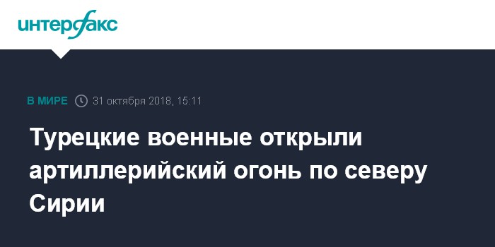 Москва. 31 октября. INTERFAX.RU - Турецкие вооруженные силы открыли артиллерийский огонь по позициям курдских вооруженных формирований на сирийской территории в районе Айн-эль-Араба, сообщает в среду Анатолийское агентство новостей.