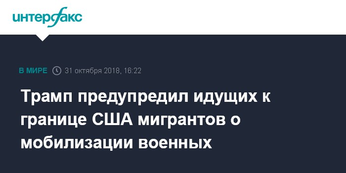 Москва. 31 октября. INTERFAX.RU - Американский президент Дональд Трамп заявил в среду, что в связи с приближением колонны мигрантов с юга войска США на границе с Мексикой мобилизованы и не пропустят ни одного незаконного мигранта на американскую территорию.
