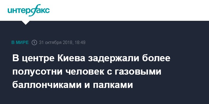 Москва. 31 октября. INTERFAX.RU - Полиция задержала в среду в правительственном квартале в центре Киева более 50 молодых людей, у которых обнаружены балаклавы, палки и газовые баллончики, у одного из них изъято оружие.