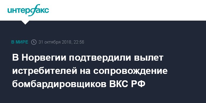 Москва. 31 октября. INTERFAX.RU - Два истребителя ВВС Норвегии F-16, поднятые по тревоге в среду, идентифицировали и сопроводили два российских стратегических бомбардировщика Ту-160, выполнявших полет над международными водами вдоль побережья страны, сообщил представитель норвежского оборонного ведомства полковник Фрэнк Солвсберг.