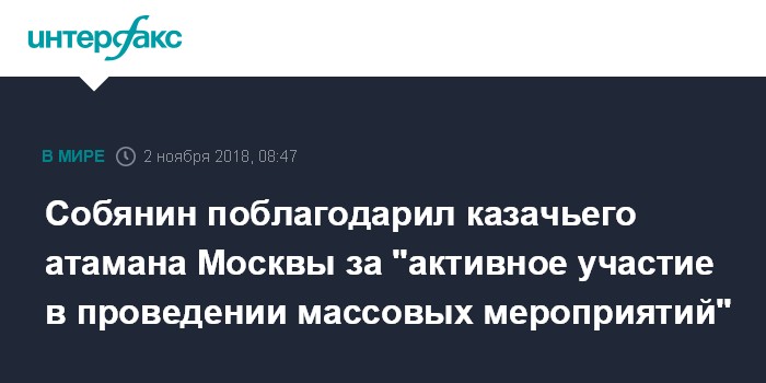 Собянин поблагодарил казачьего атамана Москвы за "активное участие в проведении массовых мероприятий"