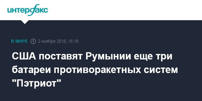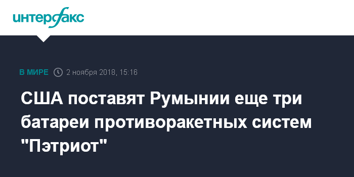 Москва. 2 ноября. INTERFAX.RU - Румынское правительство подписало соглашение с армией США и уже оплатило покупку трех дополнительных батарей противоракетных систем "Пэтриот" (Patriot), сообщила производящая их американская оборонная компания Raytheon.