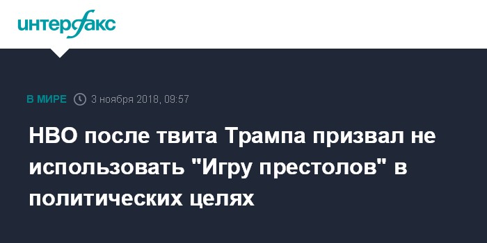 Такое заявление HBO сделал после того, как президент США Дональд Трамп опубликовал твит с отсылкой к сериалу. Он разместил в преддверии иранских санкций в своем аккаунте картинку, стилизованную под постер "Игры престолов". На нем изображен президент и надпись "Санкции близко. 5 ноября" (Sanctions are coming. 5 November). Подпись к изображению схожа с известной цитатой из сериала - "зима близко".