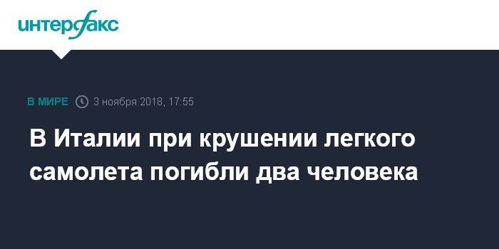 Москва. 3 ноября. INTERFAX.RU - Легкий самолет, на борту которого находилось два человека, разбился на севере Италии, сообщает в субботу агентство ANSA.