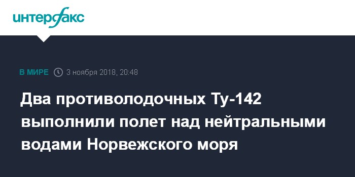 Москва. 3 ноября. INTERFAX.RU - Два противолодочных самолета Ту-142 морской авиации ВМФ России 2 ноября выполнили плановый полет в воздушном пространстве над нейтральными водами Норвежского моря, сообщает департамент информации и массовых коммуникаций Минобороны РФ.