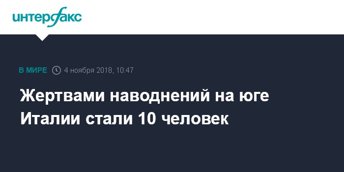 Москва. 4 ноября. INTERFAX.RU - Сильные наводнения на итальянском острове Сицилия привели к гибели 10 человек, двое из которых - дети, сообщает газета "Репубблика".