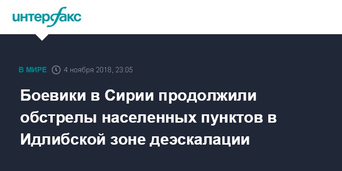 Москва. 4 ноября. INTERFAX.RU - Несмотря на установленный режим прекращения боевых действий, в Сирии продолжаются нарушения со стороны незаконных вооруженных формирований, действующих в Идлибской зоне деэскалации, сообщил на брифинге в воскресенье руководитель российского Центра по примирению враждующих сторон в Сирийской Арабской Республике генерал-лейтенант Владимир Савченко.