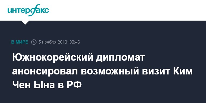 Москва. 5 ноября. INTERFAX.RU - Руководитель Северной Кореи Ким Чен Ын может нанести визит в Россию в ноябре текущего года, считает посол Южной Кореи в РФ У Юн Гын.