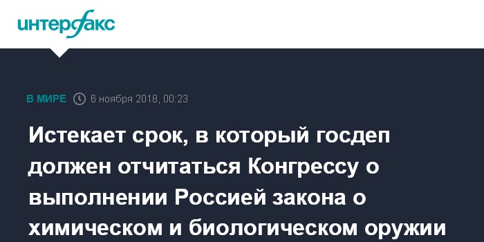 На прошлой неделе заместитель представителя госдепартамента Роберт Палладино заявлял, что "6 ноября - это крайний срок, к которому госдепартамент должен подтвердить конгрессу, что Россия выполнила условия закона о химическом и биологическом оружии".