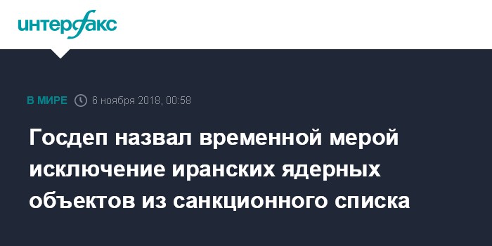 Москва. 6 ноября. INTERFAX.RU - Решение США не применять санкции против ряда иранских атомных объектов - временная мера, позволяющая контролировать действия Тегерана, связанные с ядерной программой, заявили в госдепе.