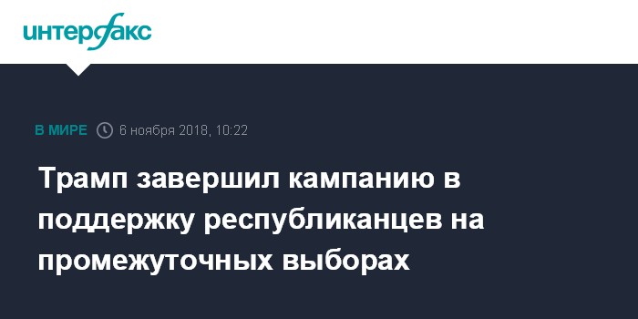Москва. 6 ноября. INTERFAX.RU - Президент США Дональд Трамп завершил свои выступления в рамках предвыборной кампании в поддержку кандидатов-республиканцев на промежуточных выборах в Конгресс США, сообщают во вторник американские СМИ.