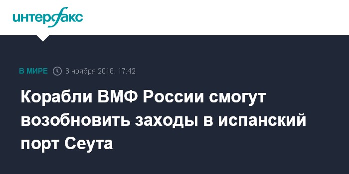 Москва. 6 ноября. INTERFAX.RU - После длительного перерыва корабли ВМФ России в ближайшее время смогут вновь заходить для пополнения запасов топлива и других припасов в испанский порт Сеута, расположенный на южном берегу Гибралтарского пролива, сообщили СМИ со ссылкой на источники в администрации порта.