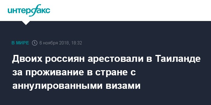 Москва. 6 ноября. INTERFAX.RU - Власти Таиланда арестовали двух граждан России, которые отказались выехать из страны после того, как их визы были аннулированы, сообщают во вторник местные СМИ.