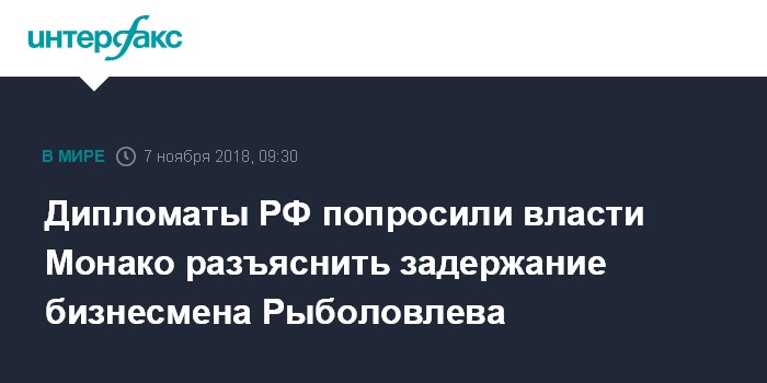 Москва. 7 ноября. INTERFAX.RU - Посольство РФ во Франции запросило разъяснений у властей Монако в связи с сообщениями о задержании российского бизнесмена Дмитрия Рыболовлева.