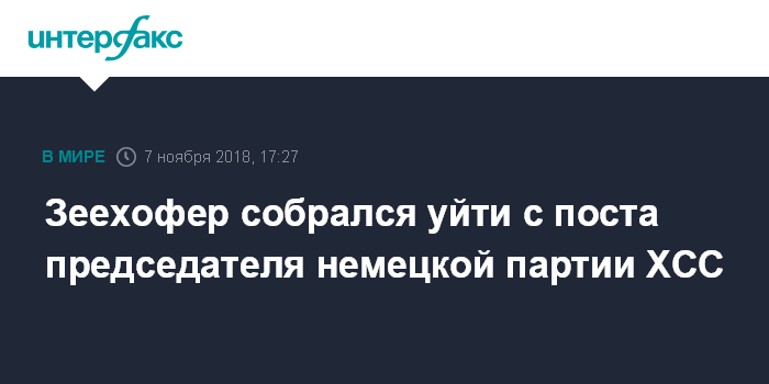 Москва. 7 ноября. INTERFAX.RU - Глава МВД Германии Хорст Зеехофер намерен покинуть пост председателя партии Христианско-социальный союз (ХСС). Об этом сообщает в среду немецкая газета Die Zeit со ссылкой на собственные источники.