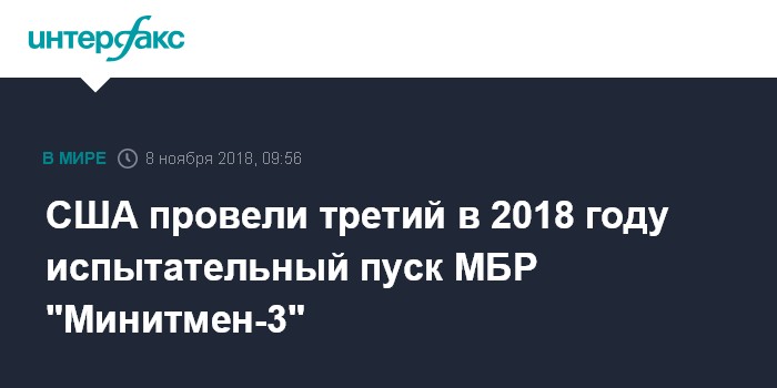 Москва. 8 ноября. INTERFAX.RU - Соединенные Штаты осуществили успешное испытание межконтинентальной баллистической ракеты (МБР) "Минитмен-3", сообщило Командование глобального удара ВВС США.