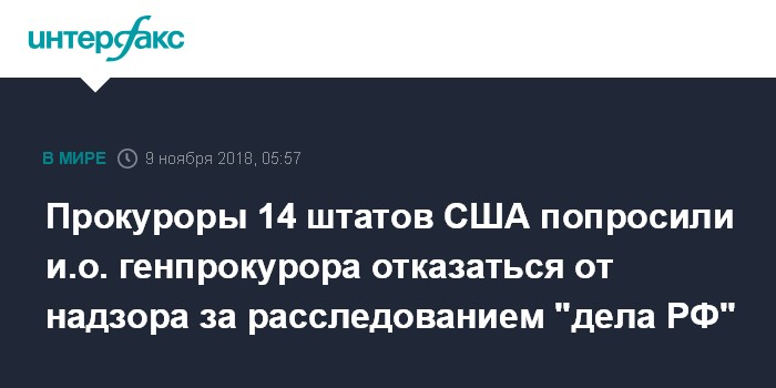 Москва. 9 ноября. INTERFAX.RU - Генпрокуроры 14 штатов США призвали и.о. генерального прокурора США Мэтью Уайтекера отказаться от надзора за расследованием "российского следа" на президентских выборах 2016 года, проводимого спецпрокурором Робертом Мюллером, сообщила газета The Hill в пятницу.