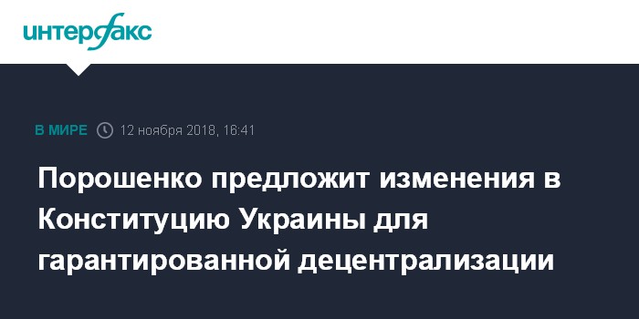 Москва. 12 ноября. INTERFAX.RU - Проект изменений в Конституцию Украины, который сделает реформу местного самоуправления неотвратимой, будет внесен на рассмотрение Верховной рады уже в ближайшее время, заявляет президент страны Петр Порошенко.