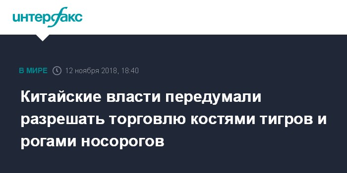 В конце октября Китай решил частично отменить запрет на торговлю костями тигров и рогами носорогов - разрешалась торговля частями тел животных, содержащихся в неволе, в научных, культурных и медицинских целях. Власти полагали, что ослабление запрета на торговлю рогами носорогов и костями тигров посодействует научным исследованиям, в частности, сбору генетического материала, медицинским исследованиям и лечению в больницах под контролем врачей. Однако заявления властей привели к многочисленным протестам экологических активистов.