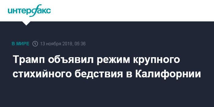 Москва. 13 ноября. INTERFAX.RU - Президент США Дональд Трамп объявил в штате Калифорния режим крупного стихийного бедствия.