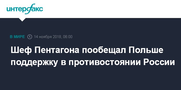 Москва. 14 ноября. INTERFAX.RU - Соединенные Штаты продолжат тесное сотрудничество с Польшей и будут поддерживать ее усилия по противостоянию России, заявил министр обороны США Джим Мэттис.