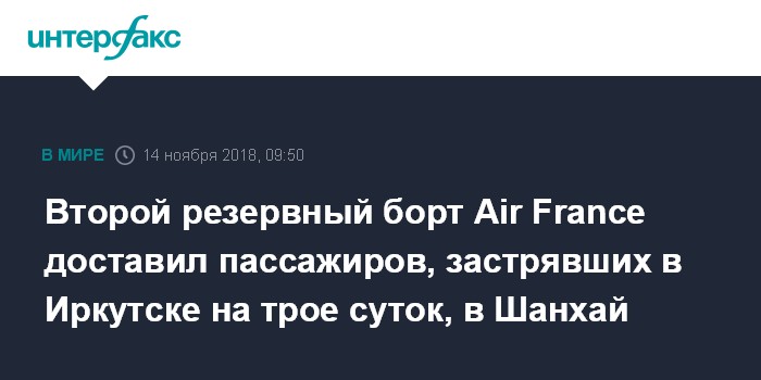 Сотрудник аэропорта сообщил "Интерфаксу", что резервный борт Air France вылетел в 9:16 по местному времени (4:16 по московскому), а сайт Flightradar24.com сообщает, что самолет в 12:45 по иркутскому времени (7:45 по Москве) приземлился в аэропорту "Пудон" Шанхая.