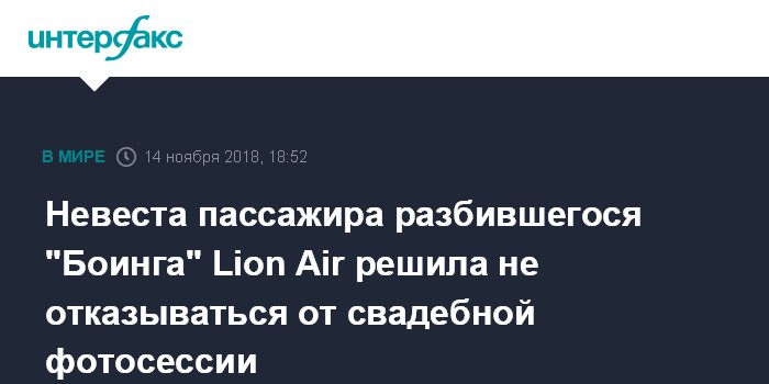 Москва. 14 ноября. INTERFAX.RU - Невеста одного из пассажиров индонезийского "Боинга" Lion Air, потерпевшего крушение у берегов Явы, решила особым образом отметить день своей несостоявшейся свадьбы, которая была назначена на 11 ноября, пишет в среду Independent.