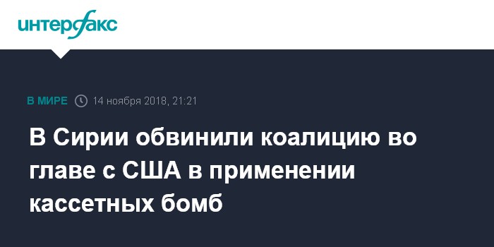 Москва. 14 ноября. INTERFAX.RU - Международная коалиция, возглавляемая США, нанесла удар по жилым районам в сирийской провинции Дейр-эз-Зор кассетными бомбами, сообщает в среду агентство SANA.