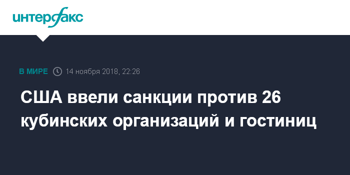 Москва. 14 ноября. INTERFAX.RU - Госдеп США в среду добавил в санкционный список по Кубе 26 организаций, контролируемых, по данным США, кубинскими военными и спецслужбами.