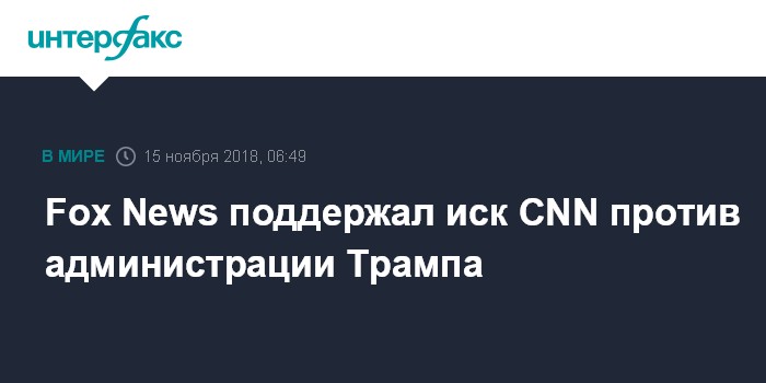 Москва. 15 ноября. INTERFAX.RU - Руководство американского телеканала Fox News назвало правильным решение CNN подать иск против президента США Дональда Трампа и ряда сотрудников его администрации в связи с лишением корреспондента Джима Акосты аккредитации в Белом доме.