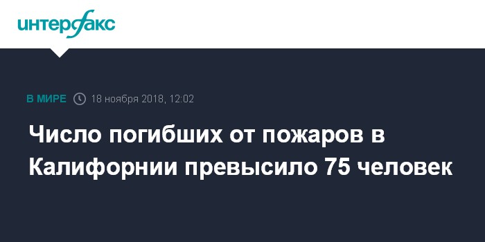 Москва. 18 ноября. INTERFAX.RU - Число жертв лесных пожаров в американском штате Калифорния увеличилось до 76 человек, сообщают в воскресенье местные СМИ.
