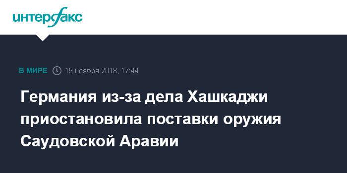 Москва. 19 ноября. INTERFAX.RU - Германия в связи с делом об убийстве журналиста Джамаля Хашкаджи приостановила поставки вооружения в Саудовскую Аравию. Об этом сообщил журналистам в понедельник представитель Минэкономики ФРГ Филипп Йорниц.