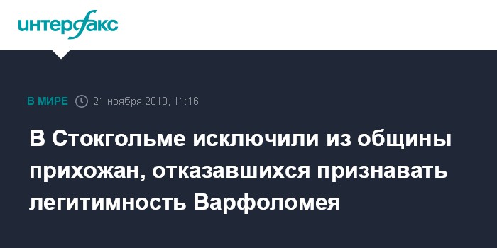 Москва. 21 ноября. INTERFAX.RU - Настоятель русского Преображенского храма в Стокгольме, находящегося в юрисдикции Константинопольской церкви, исключил из числа прихожан 16 человек, которые перестали признавать своим архипастырем патриарха Варфоломея из-за его действий на Украине.