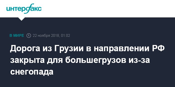 Москва. 22 ноября. INTERFAX.RU - Движение на 16-километровом участке Гудаури-Коби международной автомагистрали Мцхета - Степанцминда - Ларс (Военно-Грузинская дорога), связывающей Грузию с Россией, запрещено для трейлеров из-за снегопада и гололеда, сообщает в полночь на четверг департамент автодорог минрегионразвития и инфраструктуры Грузии.