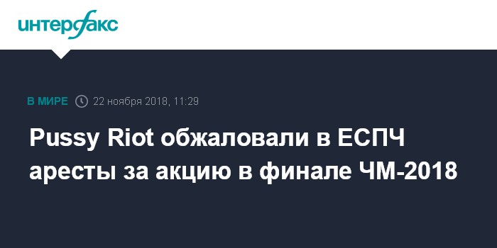 Москва. 22 ноября. INTERFAX.RU - Участники панк-группы Pussy Riot Петр Верзилов, Вероника Никульшина, Ольга Пахтусова и Ольга Курачева направили жалобу в Европейский суд по правам человека (ЕСПЧ) в связи с их арестами за акцию во время финала Чемпионата мира по футболу в Москве.