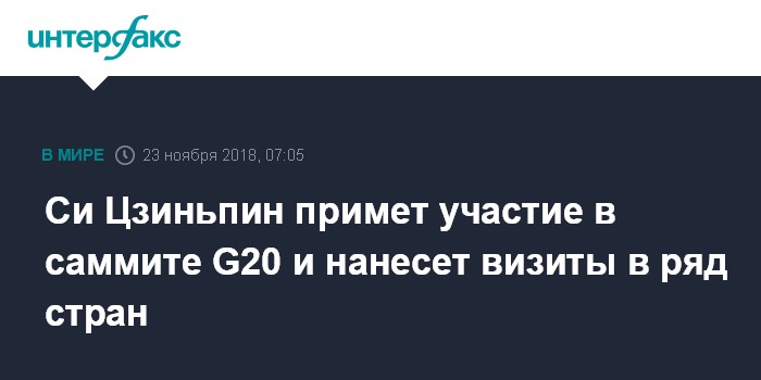Москва. 23 ноября. INTERFAX.RU - Председатель КНР Си Цзиньпин будет участвовать в саммите G20 в Аргентине с 30 ноября по 1 декабря, совместив участие с государственным визитом, сообщил в пятницу МИД КНР.