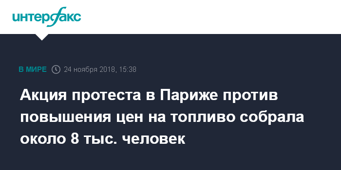 Москва. 24 ноября. INTERFAX.RU - Около 8 тыс. человек в субботу пришли в центр Парижа для участия в демонстрации против повышения цен на топливо, среди них замечены представители ультраправых движений, сообщают французские СМИ.