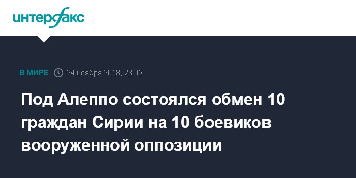 Москва. 24 ноября. INTERFAX.RU - Обмен 10 удерживаемых незаконными вооруженными формированиями граждан Сирии на 10 боевиков отрядов вооруженной оппозиции состоялся 24 ноября на территории САР в районе населенного пункта Тадэф (35 км северо-восточнее г. Алеппо), сообщил в субботу на брифинге руководитель российского Центра по примирению враждующих сторон в Сирии генерал-лейтенант Сергей Соломатин.